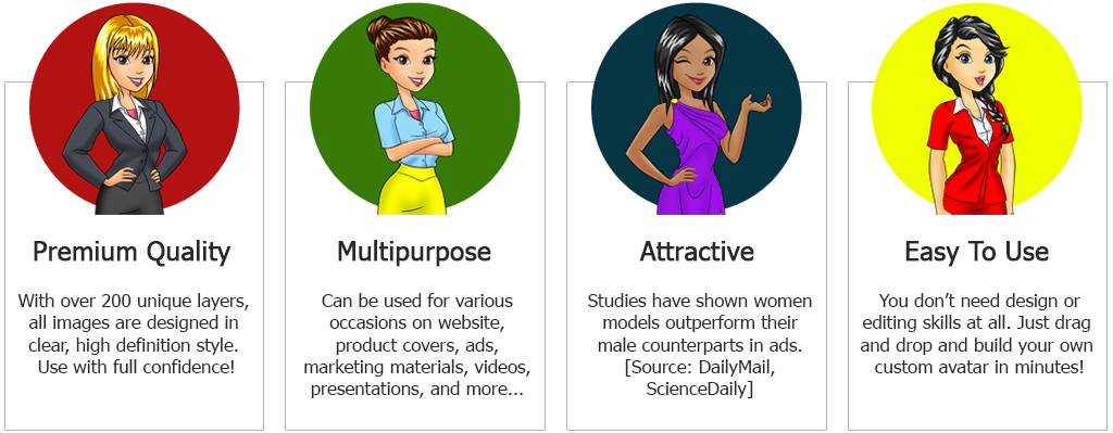 A: Not at all! And that's the beauty of it. You don't need graphic design and editing skills to be able to use our mascot bundle. As long as you know how to point and click, drag and drop, you know enough to use Female Mascot Maker!